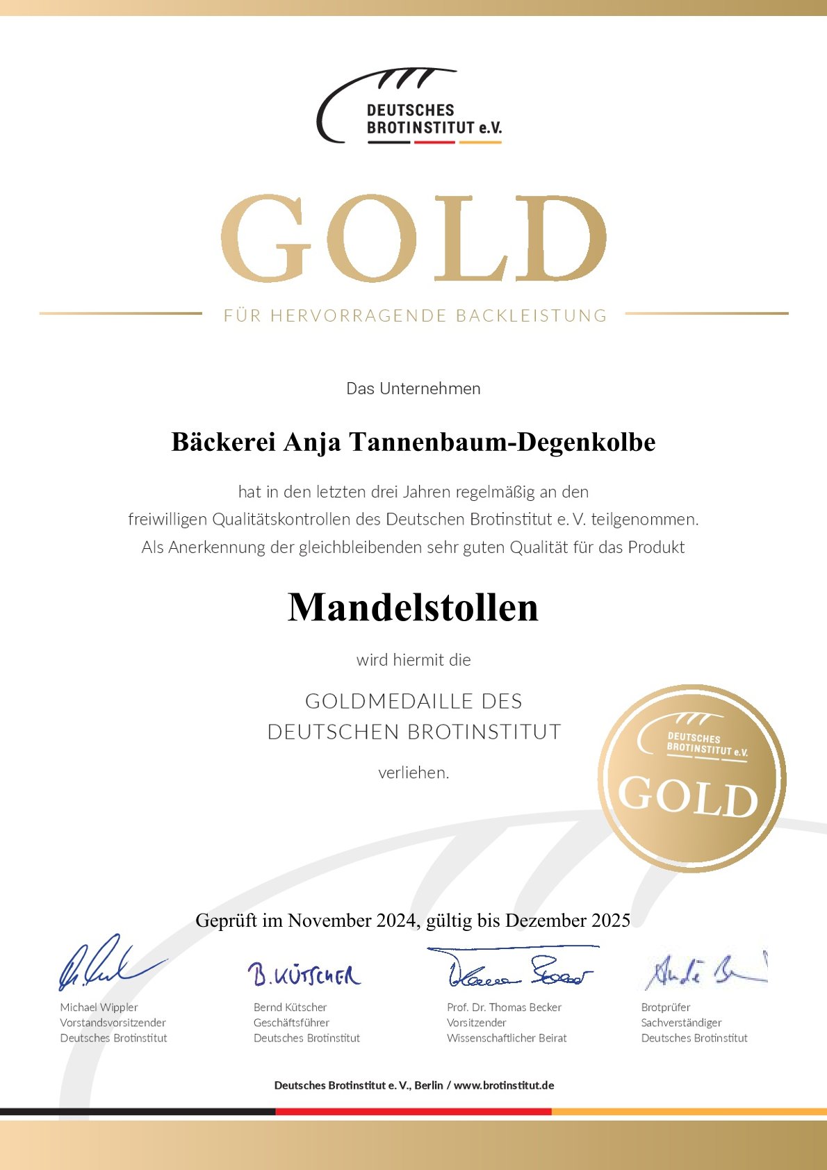 Zusätzlich erhielten unser Rosinenstollen und Mandelstollen eine GOLD-Medallie für gleichbleibende Spitzenqualität!